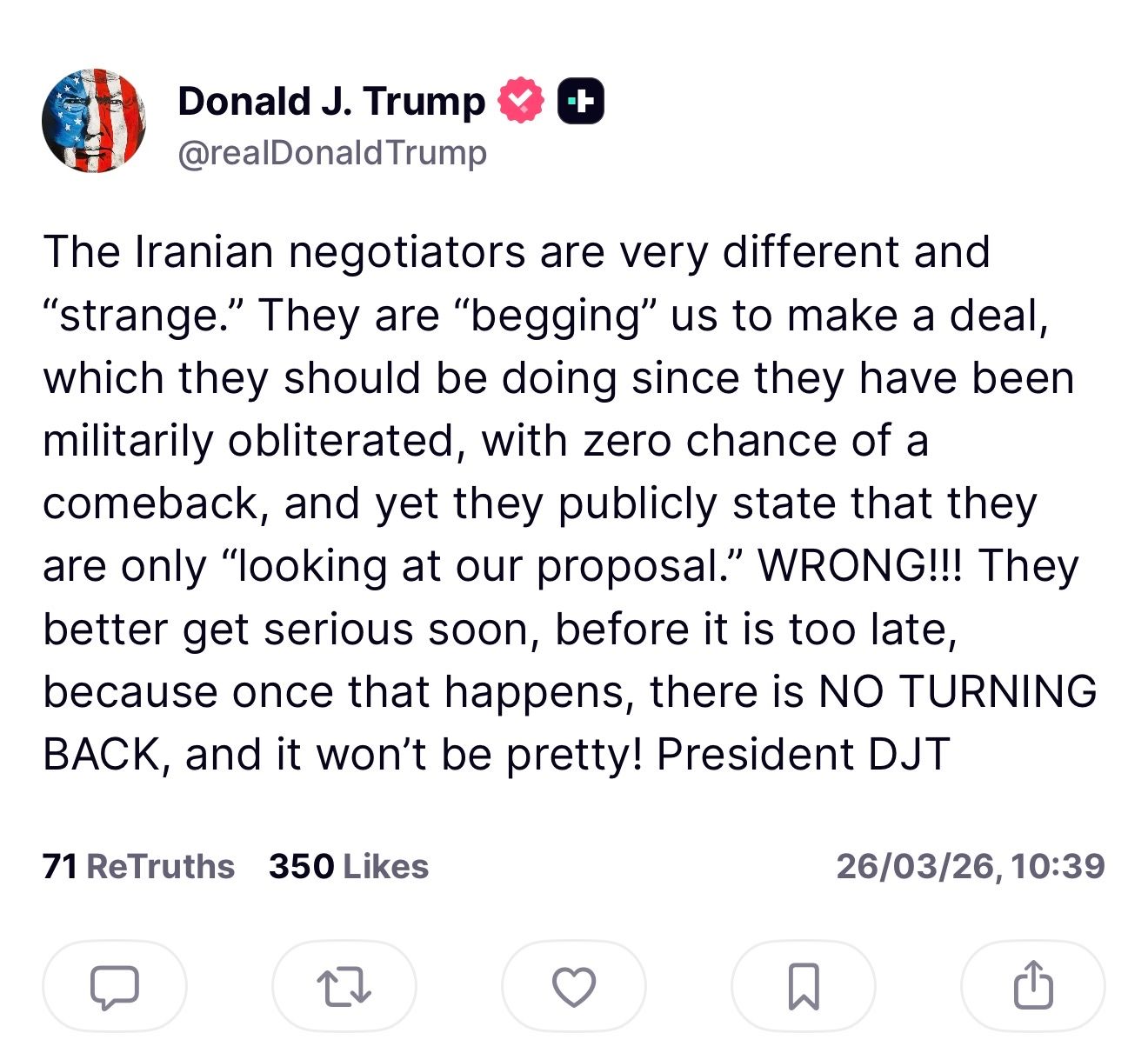دونالد ترامپ، رییسجمهوری آمریکا، در پیامی نوشت مذاکرهکنندگان ایرانی بسیار متفاوت و «عجیب» هستند و برای رسیدن به توافق به آمریکا «التماس» میکنند.
