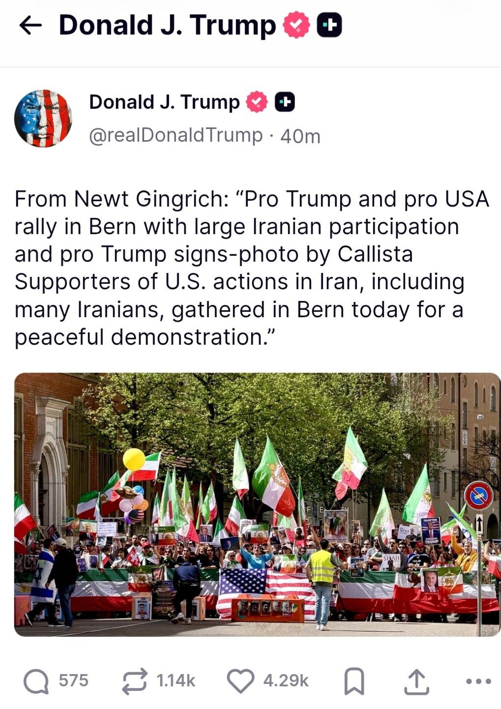 دونالد ترامپ، رییسجمهوری آمریکا، در تروثسوشال عکسی از تجمع ایرانیان در برن سوییس در حمایت از اقداماتش علیه جمهوری اسلامی را بازنشر کرد.