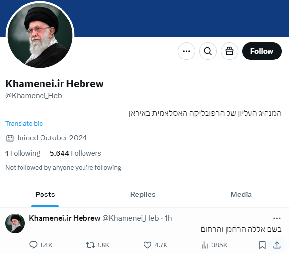 پس از حمله اسرائیل به ایران، حساب دفتر علی خامنهای در ایکس یک صفحه به زبان عبری راهاندازی کرد. این صفحه در اولین پست خود عبارت «بسمالله الرحمن الرحیم» را به زبان عبری نوشت.